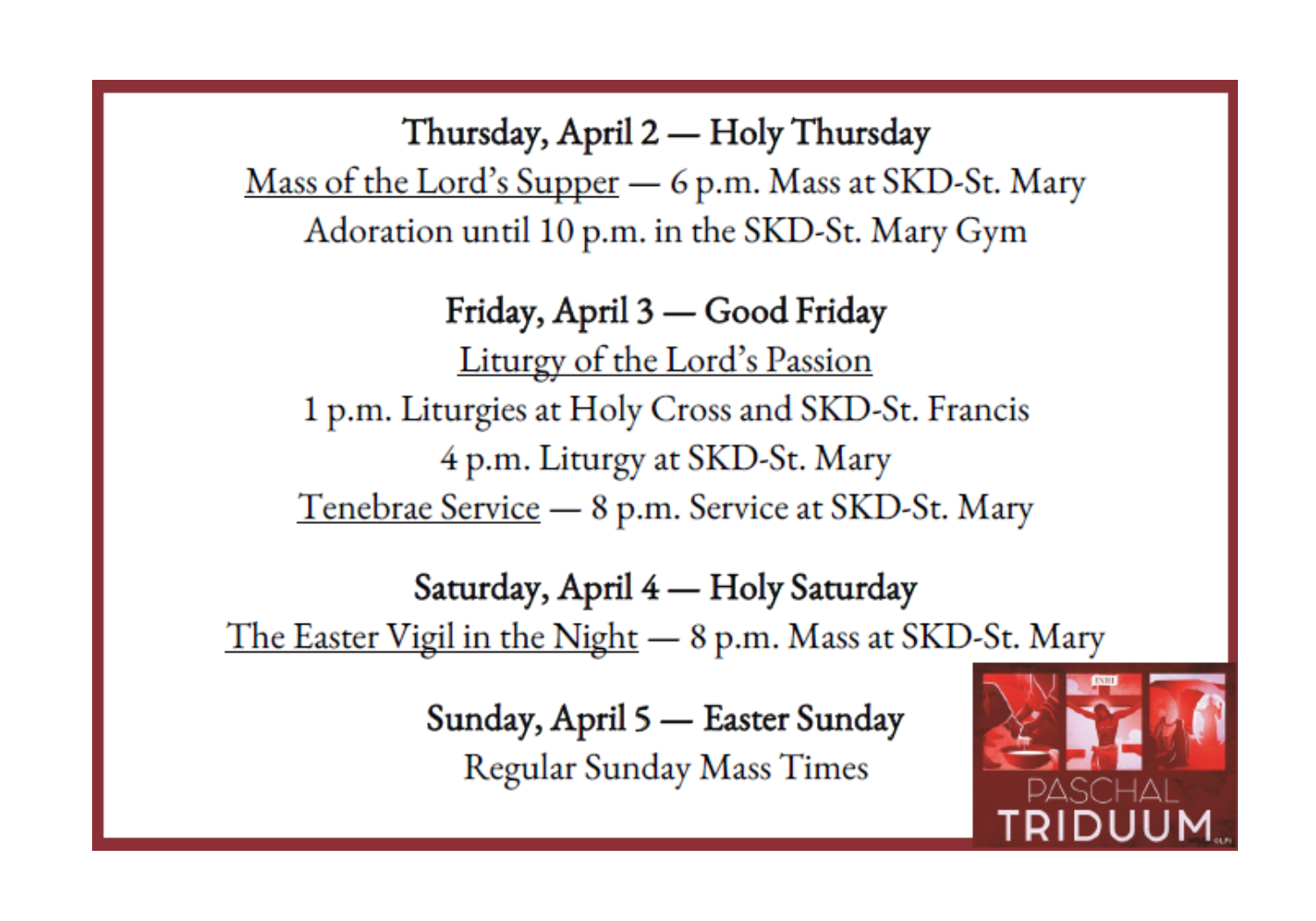 Because school is cancelled, Masses and Adoration on Tuesday, March 17 are cancelled. SKD-St. Mary church will be open for private prayer. The parish and SCRIP offices will be open, and afternoon and evening meetings and events will take place.