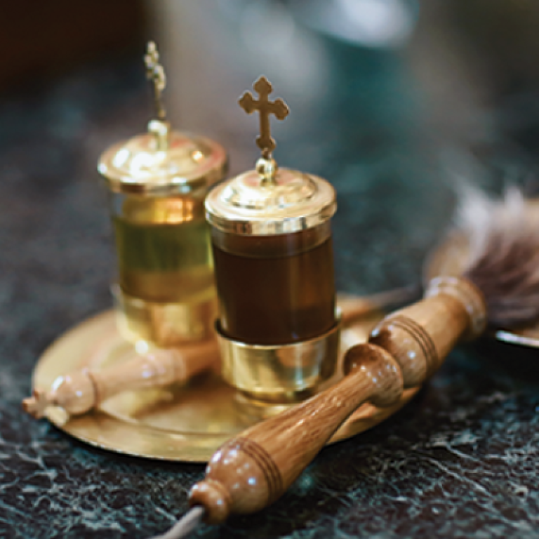 When the priest is called for the anointing of the sick, all the people gather with the person who is ill. There is a greeting, a reading from scripture, some words of comfort in our faith. The priest will then lay hands on the person and pray over them, calling down the Holy Spirit. Then the priest anoints the person's forehead and hands as he says the words of the sacrament. Everyone then says the